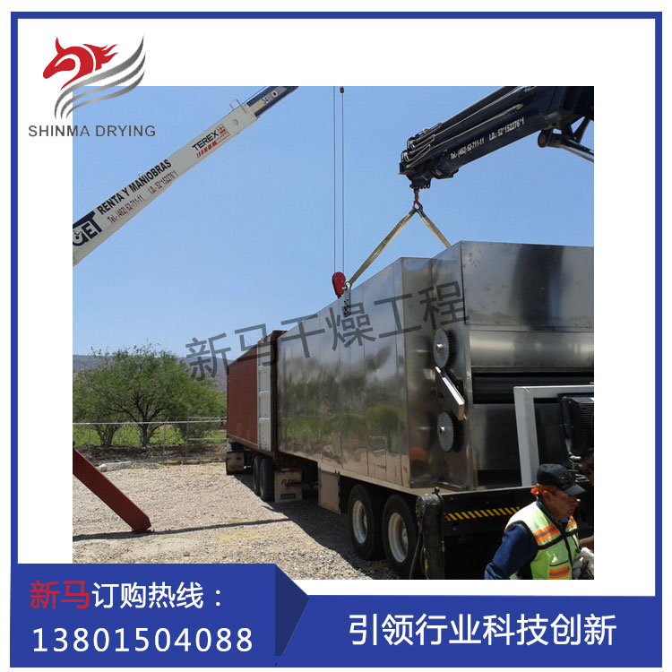 整台设备为全封闭型(对物料而言),加料系统、热风系统、出料系统和排湿系统五部分组成。加料段作用使物料均匀分散在网板上,并且匀速输送到干燥段;热风系统是提供干燥所需的热源,提供约90℃热风至干燥室;在输送带通过时,热空气从上往下或从下往上通过输送带上的物料,从而使物料能均匀干燥,再经冷却段冷却后,由出料段排出。