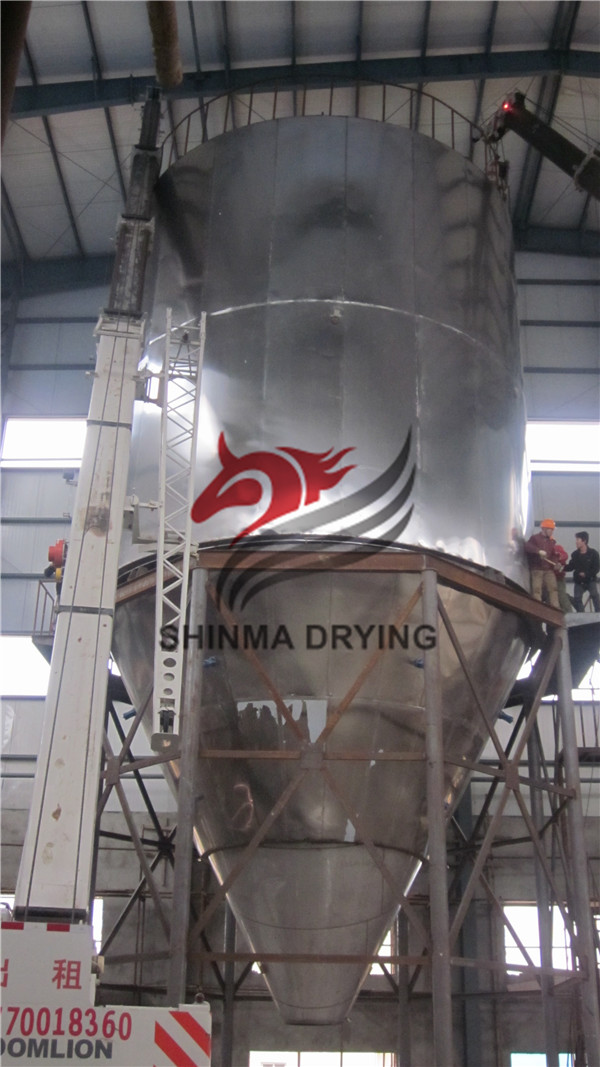 空气经空气过滤器后进入加热器,加热到给定的温度后以切线方向进入热风分配器,经热风分配器作用后的空气,均匀地、螺旋式地进入干燥室,同时料液由雾化器雾化为细小的雾滴,当雾滴与热空气混合接触后传热传质,水分迅速汽化。粉末或颗粒产品落到干燥塔锥底进入积料筒。少量细粉随空气流入除尘器被分离,zui后夹带水分的热空气由风机排空。
