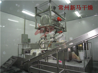 该鸡精生产线由两条生产线组成,每条线产能为1.5吨/小时。除主体生产设备高速立式混合机、旋转制粒机、振动流化床干燥机、振动筛各自独立外,前处理间的万能粉碎机和内包装间的半成品储存却又相互通用。该生产线的性能优点如下: